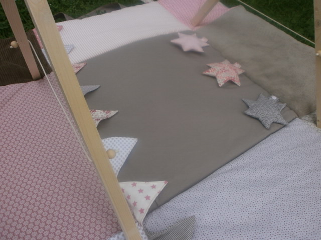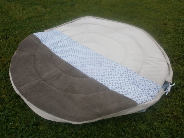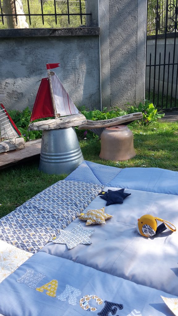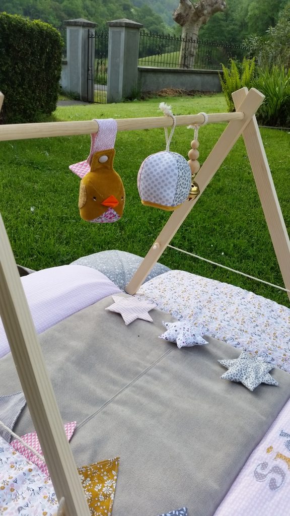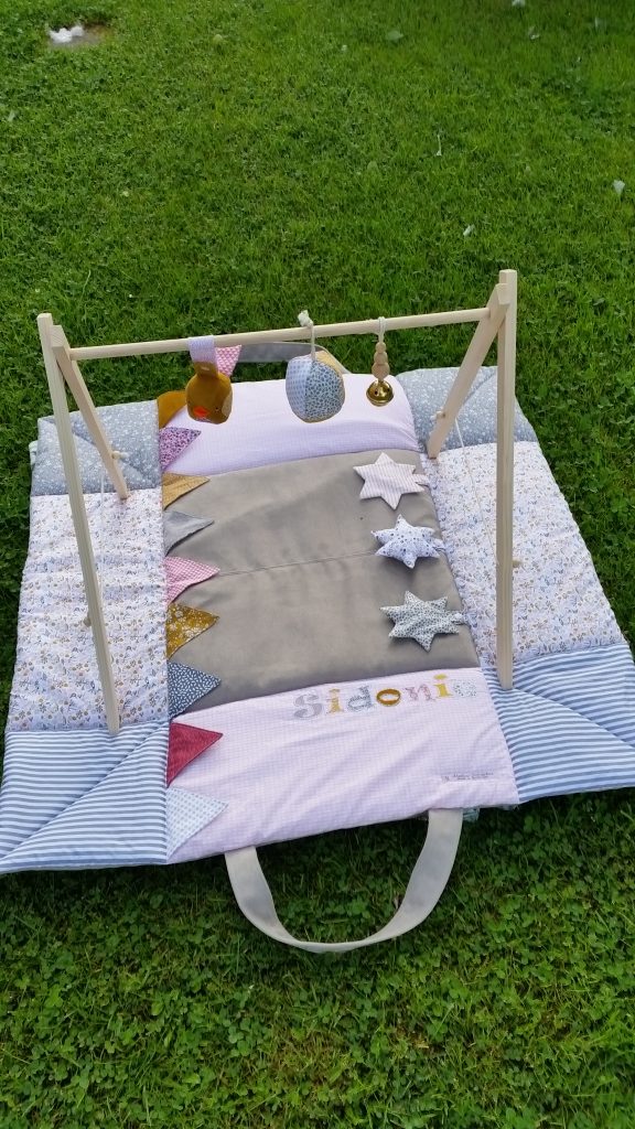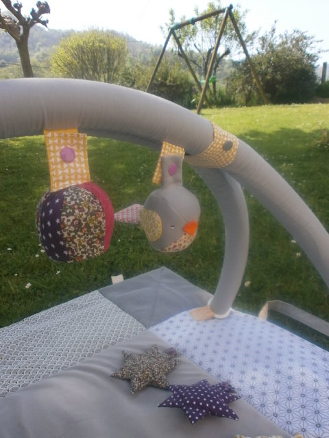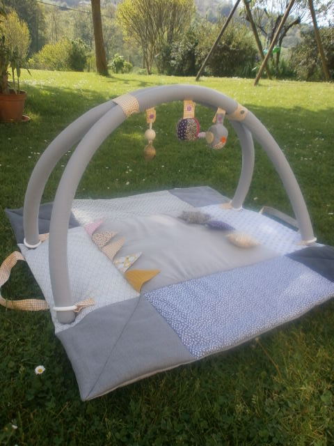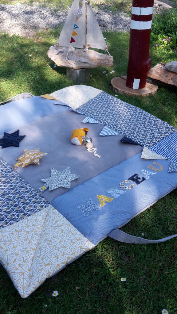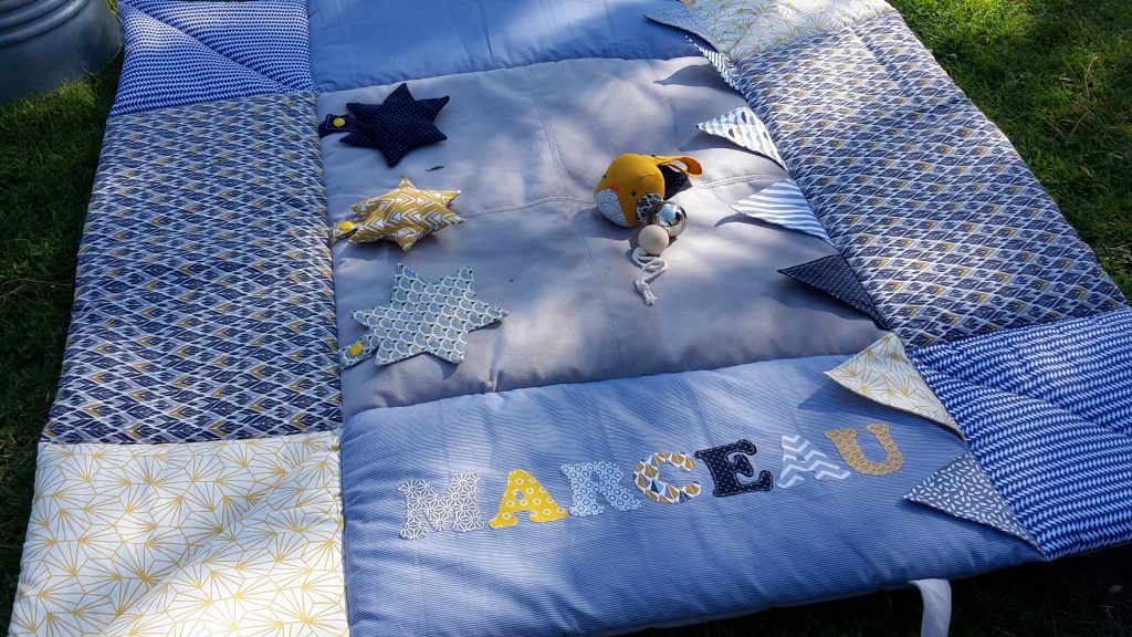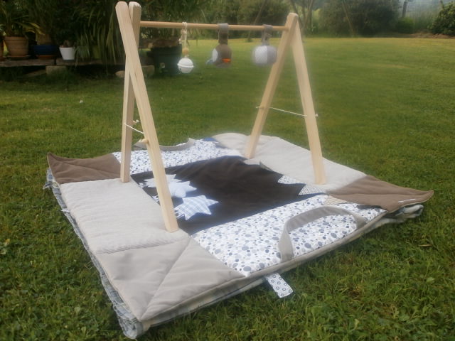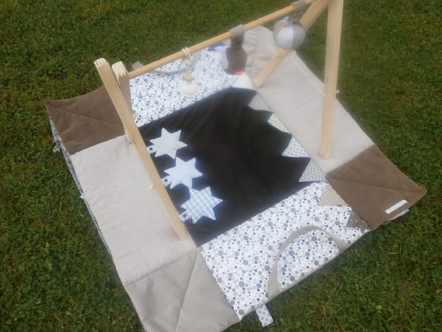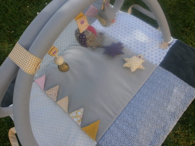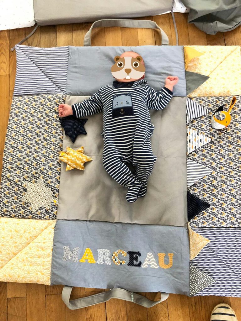 Petit Marceau a reçu son tapis d’éveil. Les couleurs demandées étaient bleu nuit, gris et moutarde.
